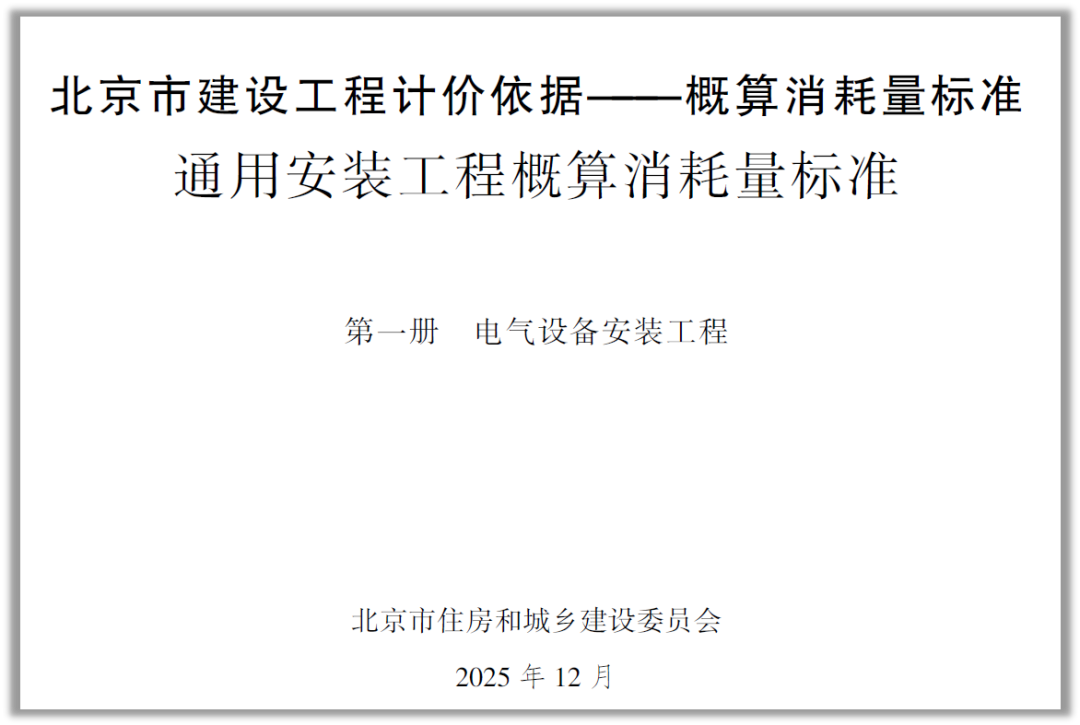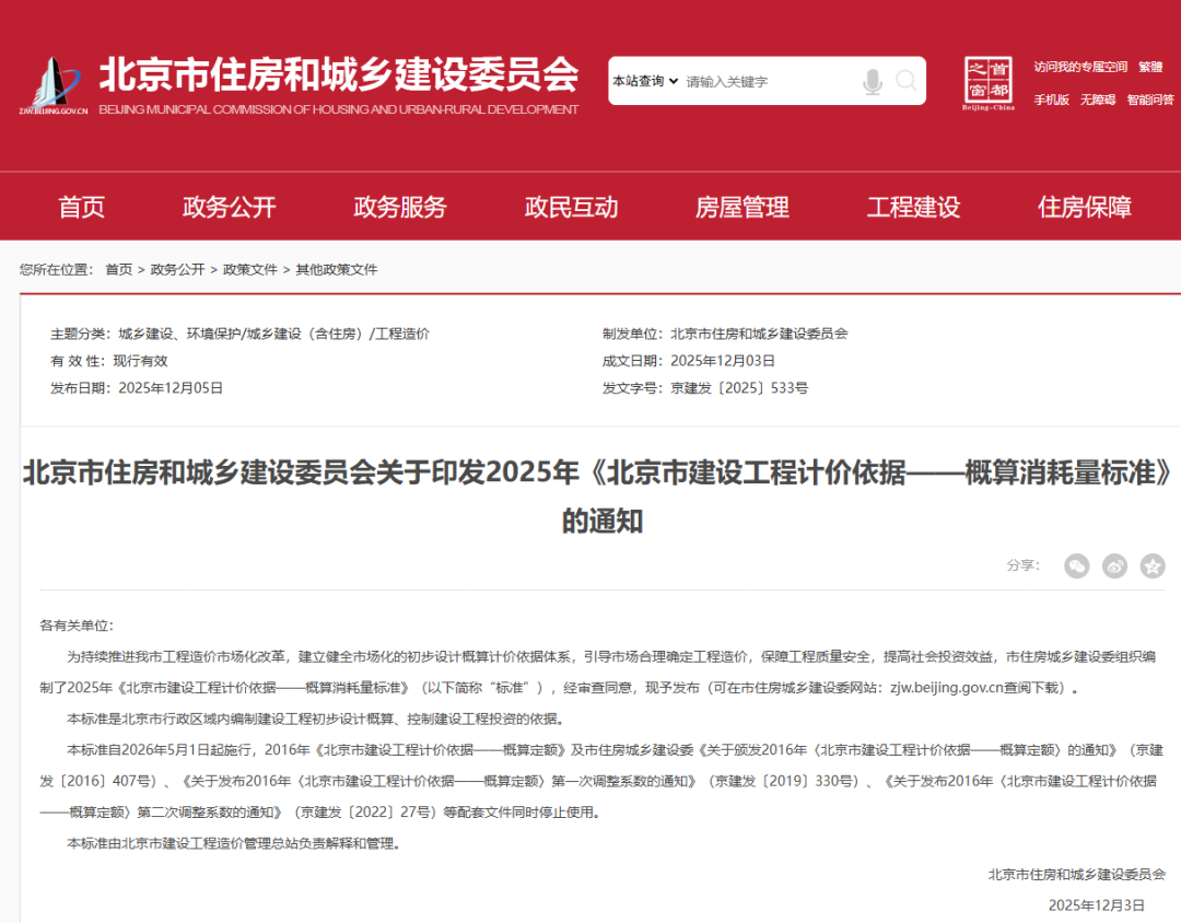 12月5日,北京市住房和城鄉(xiāng)建設委員會正式發(fā)布了2025年《北京市建設工程計價依據——概算消耗量標準》。本標準是北京市行政區(qū)域內編制建設工程初步設計概算、控制建設工程投資的依據,自2026年5月1日起施行。